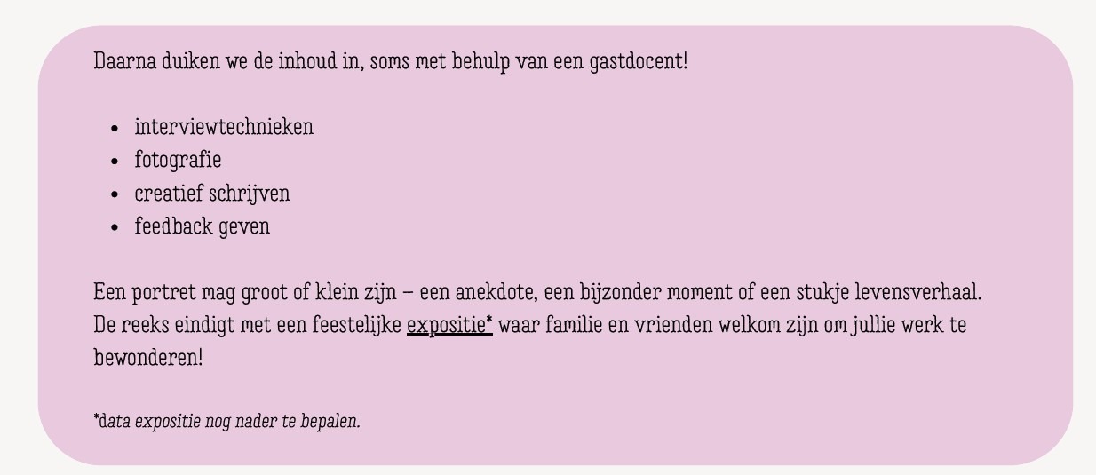 In deze workshopreeks maak je stap voor stap een persoonlijk portret van iemand uit Soesterberg en omgeving – in tekst én fotografie.